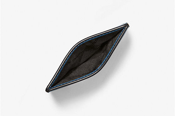 Versatile interior pouch for coins, cash, band-aids, or extra cards with premium blue lining.